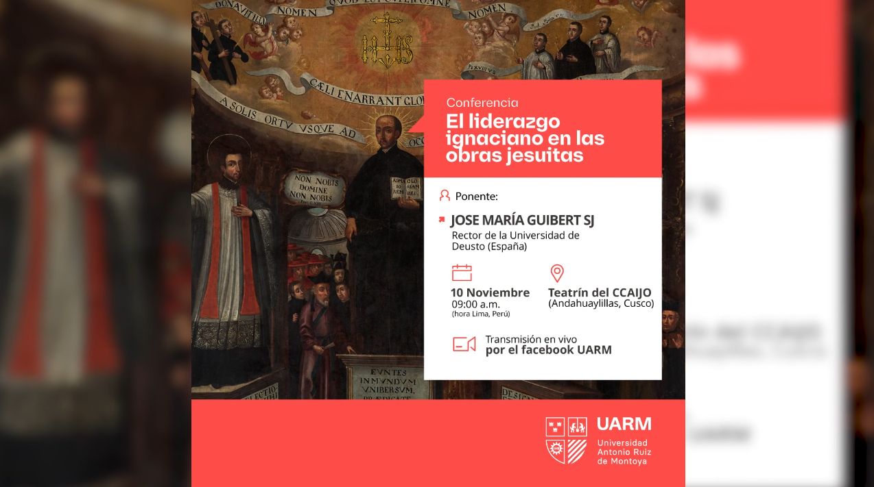 La Universidad Antonio Ruiz de Montoya presentó la Conferencia: El liderazgo ignaciano en las obras jesuitas, el 10 de noviembre en el Teatrín de la Parroquia de Andahuaylillas, Cusco. El evento contó con la ponencia del P. José María Guibert SJ, rector de la Universidad de Deusto (España), quien compartió alcances sobre la importancia del liderazgo ignaciano en las obras de la Compañía de Jesús y brindó detalles acerca de las capacidades que demanda ser un líder ignaciano.